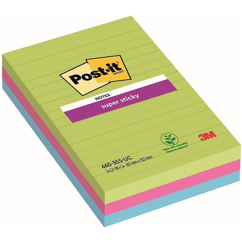 Karteczki Post-it Super Sticky 102x152mm (660-3SS-UC) w linie 3 kolory (3×90)