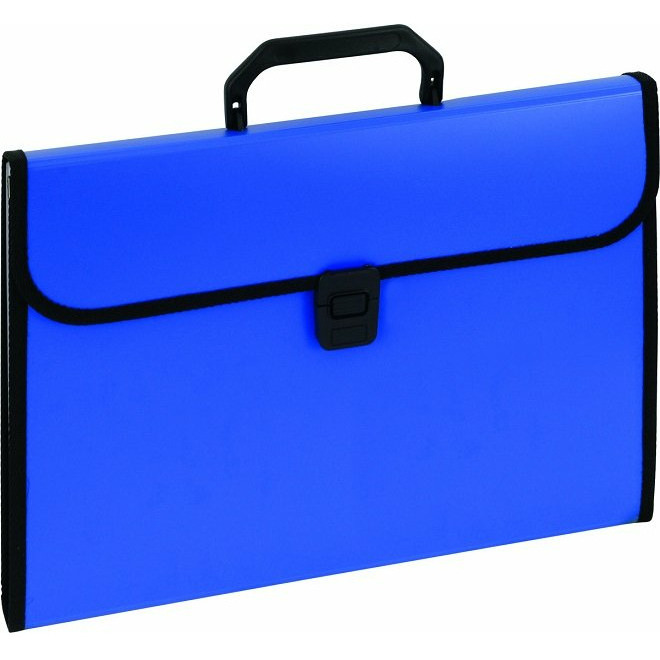 * teczka z rączką na grzbiecie * materiał: polipropylen PP * 12 przegródek * przekładki indeksujące * okienka opisowe * 2 kieszonki na wizytówki * zamykana na klamrę * rączka na grzbiecie * kolor niebieski * format A4 * jednostka sprzedaży 1 szt.