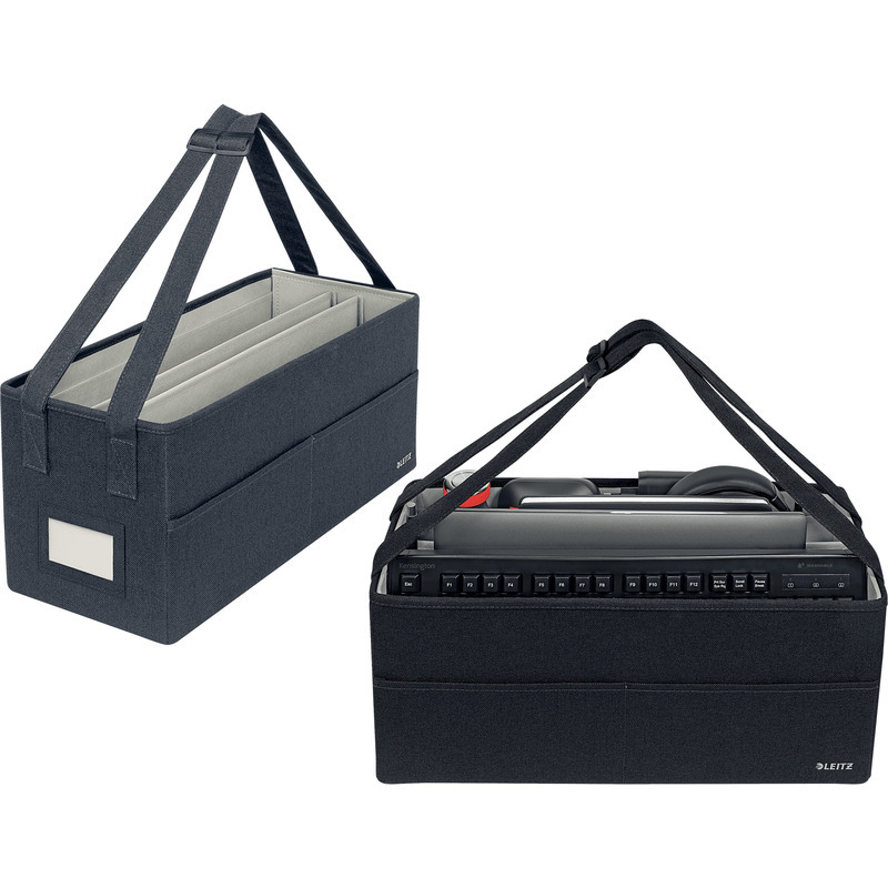 * składana torba do przechowywania akcesoriów do pracy przy „gorących biurkach” pomoże Ci w utrzymaniu porządku w biurze i w domu * pomieści laptopa, klawiaturę, mysz, kabel do ładowania, zestaw słuchawkowy, notebooka, butelkę na wodą i inne potrzebne Ci na co dzień akcesoria * posiada 3 przegrody do porządkowania zawartości, z centralną sekcją przeznaczoną na przechowywanie laptopa * szybki i łatwy montaż, wystarczy rozłożyć torbę, nie wymaga używania kleju * w pełni składana, aby zaoszczędzić miejsce, gdy nie jest używana * 2 stylowe uchwyty zwiększają komfort noszenia torby * lekka i wytrzymała, pozwala na przenoszenie zawartości o wadze do 8 kg * produkt można w pełni zdemontować, w 71% nadaje się do recyklingu * opakowanie nie zawiera plastiku * torba wykonana jest z miękkiej tkaniny chroniącej zawartość, wzmocnionej tekturą pochodzącą z recyklingu, która zwiększa wytrzymałość i trwałość torby * produkty do przechowywania z kolekcji Leitz Fabric łączą poczucie domowego komfortu z najwyższą jakością wykonania, tworząc pozytywne i produktywne środowisko pracy * wymiary: 465 x 210 x 200 mm