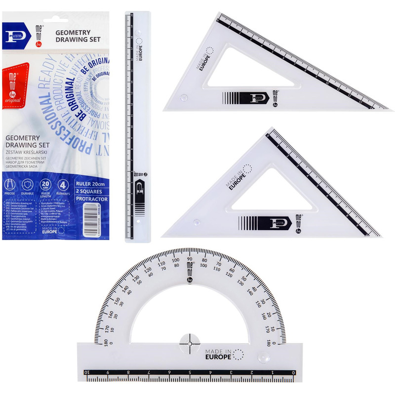 * zestaw kreślarski MemoBe by PRATEL * czteroelementowy szkolny zestaw kreślarski w opakowaniu z polietylenu (polietylen to tworzywo sztuczne należące do grupy poliolefinów, czyli polimerów, które składają się wyłącznie z węgla oraz wodoru – polietylen jest giętki, przezroczysty oraz termoplastyczny) * w opakowaniu: 2 standardowe przezroczyste ekierki 10,8 cm/45 stopni i 15,3 cm/60 stopni, kątomierz 10 cm/180 stopni oraz linijka 20 cm * elementy zestawu posiadają trwałą nieścieralną podziałkę * zaokrąglone rogi dla bezpieczeństwa użytkownika * precyzyjny nadruk skali (do 0,001 cm) * wykonane z plastiku o odpowiednim stosunku twardości do elastyczności zapewniającym wysoką odporność na złamania * pakowane w woreczki z zawieszką * jednostka sprzedaży 1 opakowanie * marka MemoBe została założona w 1993 roku i dzięki intensywnemu rozwojowi zajmuje kluczowe miejsce wśród producentów z branży artykułów biurowych i szkolnych w Polsce, każdy produkt MemoBe to gwarancja wysokiego komfortu pracy podczas codziennego użytkowania, w produkcji wykorzystywane są tylko materiały wysokiej jakości