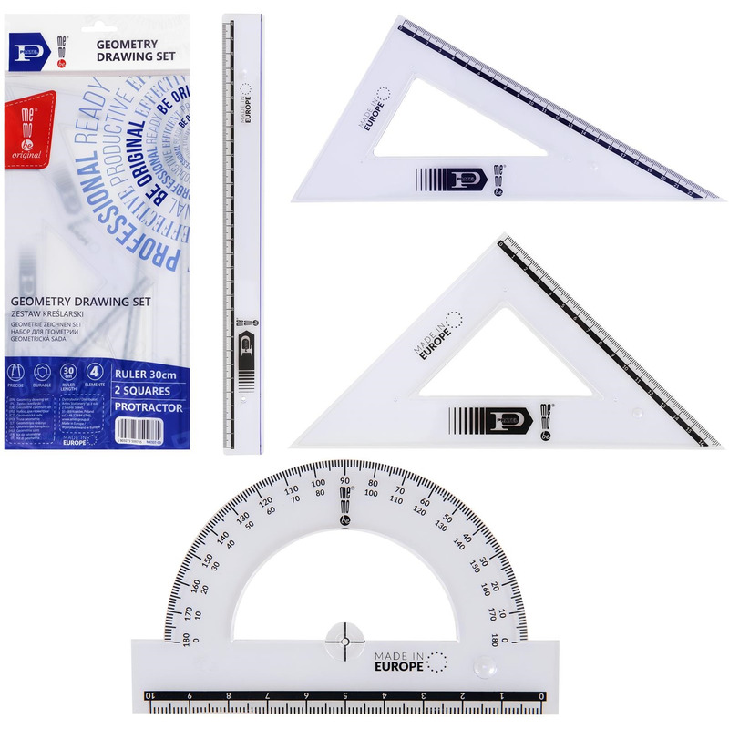 * w opakowaniu: 2 standardowe przezroczyste ekierki 16,8 cm/45 stopni i 23,7 cm/60 stopni, kątomierz 10 cm/180 stopni oraz linijka 30 cm